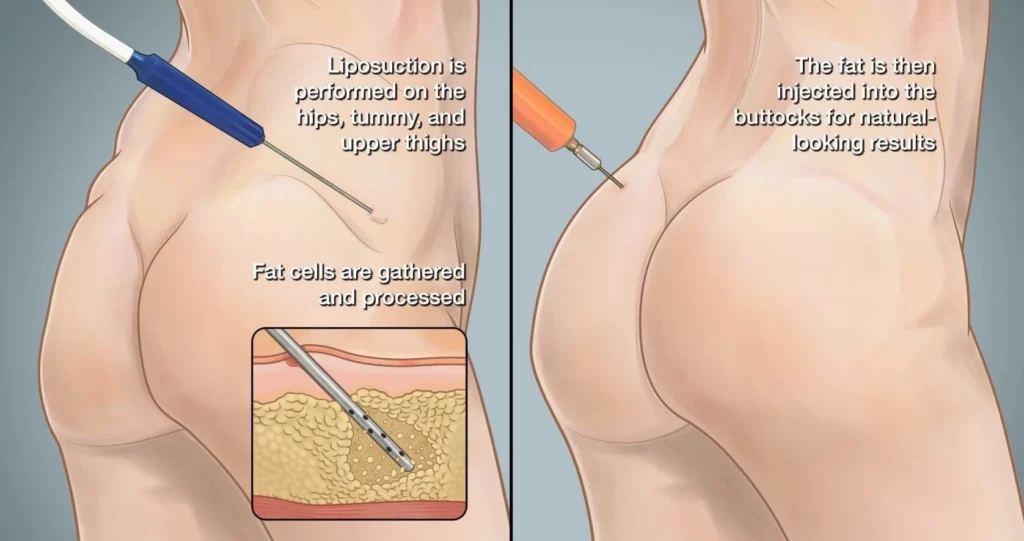 The fat, tissue and blood that were removed through liposuction are then processed. The syringes are then connected to a special cannula to add the fat to the buttocks through small injections all over your behind.