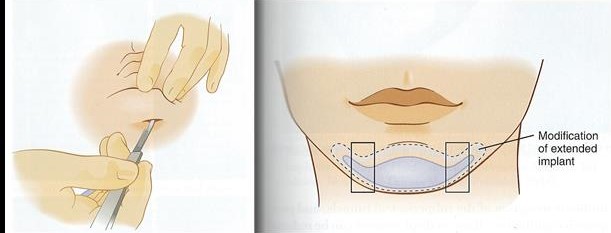 For a chin implant, the incision may be inside your mouth, along the crease that joins your lower lip and gums. An incision just beneath the chin is an alternative.