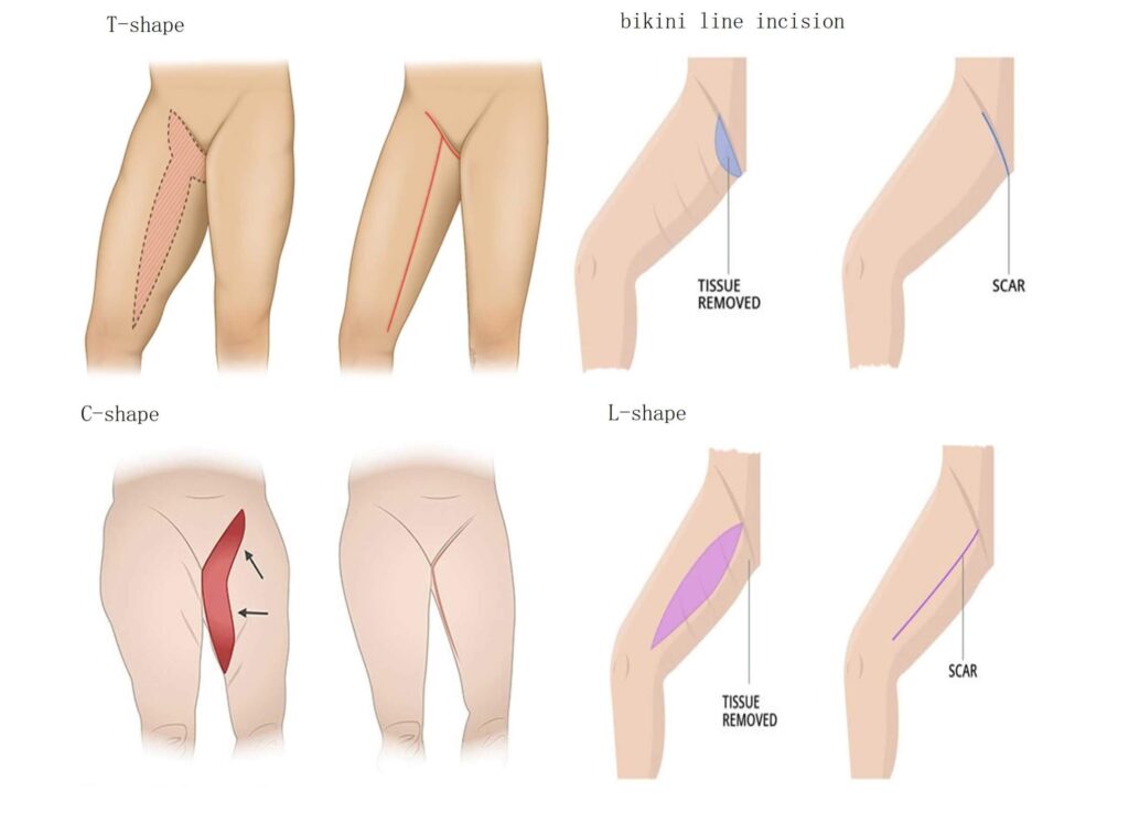 Advanced techniques usually allow incisions to be placed in strategic locations where they can be hidden by most types of clothing and swimsuits. in some cases incision extended lateral from the west to the knee . However, incisions may be extensive.